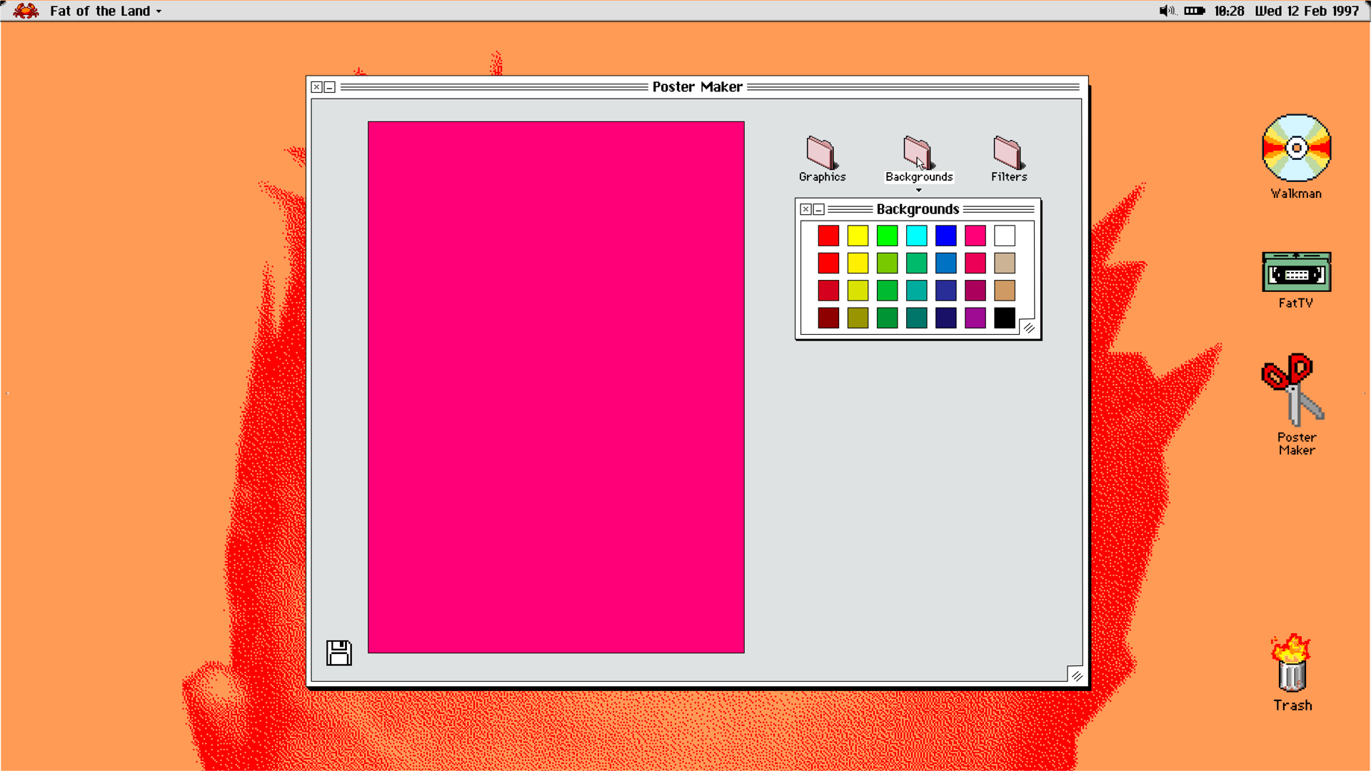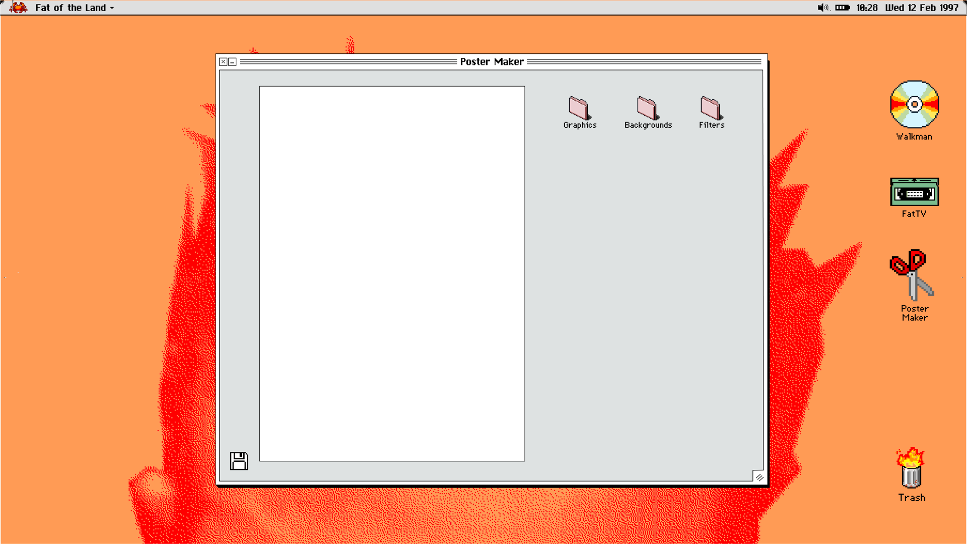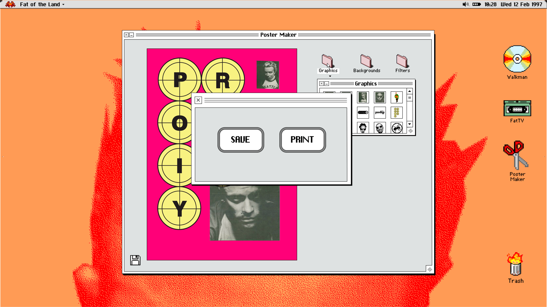 that pinches its claws while it loads, accompanied by Prodigy lyrics. The website loads up to a simple desktop-style homescreen. You can change the background and ‘clean up’ your desktop. The ‘apps’ on the website are the Walkman – a music player for the album, FatTV – a media player for reimagined music videos, and a Poster Maker – to make your own Prodigy poster. The Walkman can be played/paused and skipped through as the CD spins. The media player proposes the idea of reimagined music videos, using archival footage of the band and England in 1997. This is intended to bring the target audience into the historical context, to comprehend in a way that’s visually exciting. The Poster Maker is aimed at the target audience’s love for visual culture, the opportunity to interact and be creative without spending any money/time on software. The user has the option to choose a background and mix and match graphics. Without limit to how many the user can make, the option to save their poster to the website’s desktop while listening to the album while they create, it gives the user a reason to stick around.